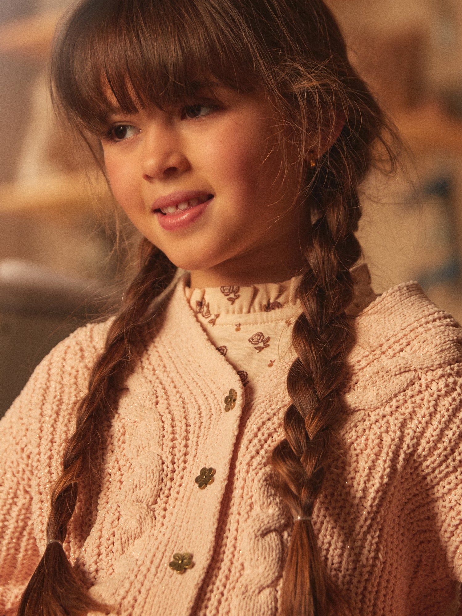 Ajoutez une touche de brillance à la garde-robe de votre enfant avec ce cardigan nude en maille, parfait pour les jours frais de l'automne et de l'hiver.Ce cardigan se distingue par son effet métallisé et ses torsades élégantes sur le devant et au dos, offrant un look à la fois chic et confortable.Les boutons en forme de fleurs et les bords côtelés ajoutent une touche délicate et raffinée à ce cardigan, parfait pour compléter n'importe quel ensemble avec style.