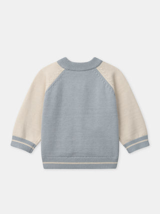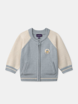 Perfekt für kühle Tage, ist dieser zweifarbige blau-graue und beigen Pullover warm und praktisch. Die kontrastierenden Ärmel und die beiden Fronttaschen machen ihn funktionell. Der vollständige Reißverschluss macht das Ankleiden einfach und verleiht ihm einen modernen Stil.