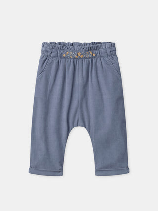 Für Kinder, die im Winter aktiv sind, bietet diese blau-graue Samthose Wärme und Komfort. Der elastische Bund und die vorderen und hinteren Taschen erleichtern das Ankleiden. Die in hellbraun, gelb und blau gestickten Blumen am Bund verleihen einen zarten Stil.