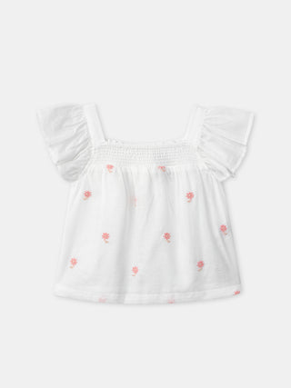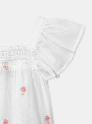 Cette blouse accompagne une enfant rêveuse au printemps et en été. Confectionnée en voile léger avec smocks sur le buste, elle présente une coupe fluide et confortable. Les fleurs brodées roses s’inscrivent dans un univers doux et poétique.