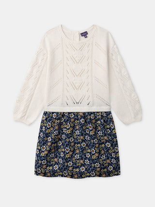 Zweimaterial Kleid mit Pullover-Oberteil in Ecru und floralem Rock für Mädchen