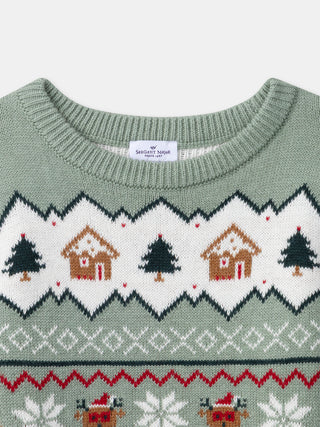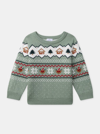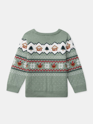Idéal pour les garçons curieux et actifs en hiver, ce pull enveloppe de chaleur et de confort. Maille verte, écrue et rouge avec bord côte au col, poignets et taille. Motifs jacquard de rennes, sapins et flocons pour une ambiance de Noël en famille.