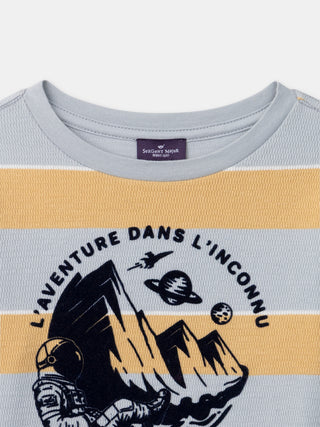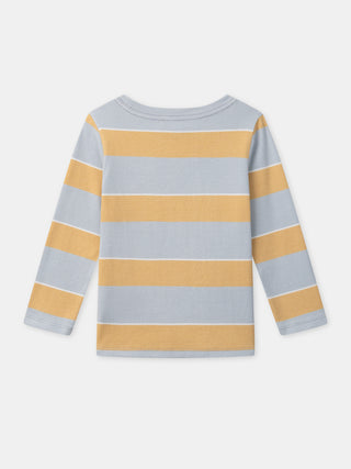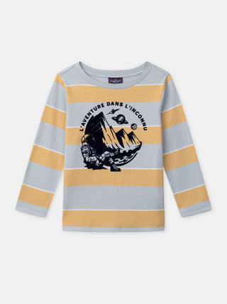 Entwickelt für kleine Entdecker in der Übergangszeit, ist dieses gestreifte T-Shirt in ocker und blaugrau gleichermaßen bequem und praktisch. Hergestellt aus modischem Jersey, lässt es sich leicht mit Jeans oder einer Hose kombinieren. Seine Schriftzüge und der bedruckte Aufdruck auf der Vorderseite geben einen Hauch von Abenteuer.
