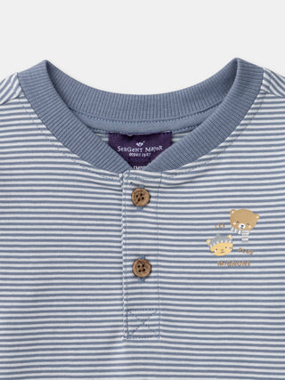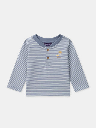 Ideal für aktive Kinder, dieses gestreifte blau-graue und ecrufarbige T-Shirt lässt sich leicht im Alltag tragen. Es besteht aus weichem Jersey mit einem Tierdruck auf der Brust. Der Vorneverschluss mit Knöpfen und der einfarbige Besatz am Halsausschnitt sorgen für Komfort und Praktikabilität.