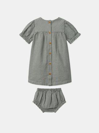 Dieses Vichy Kleid ist ideal für sommerliche Tage und vereint Komfort und Eleganz. Die Ballonärmel und die aufgestickten Blumen auf der Brust in zarten Rosa-, Neon- und Koralltönen verleihen einen sanften, farbenfrohen Akzent, während die Muscheldetails auf der Brust ihren Charme verstärken. Die durchgehende Öffnung am Rücken mit Holzknöpfen und das passende Bloomers sorgen für ein praktisches und abgestimmtes Aussehen.